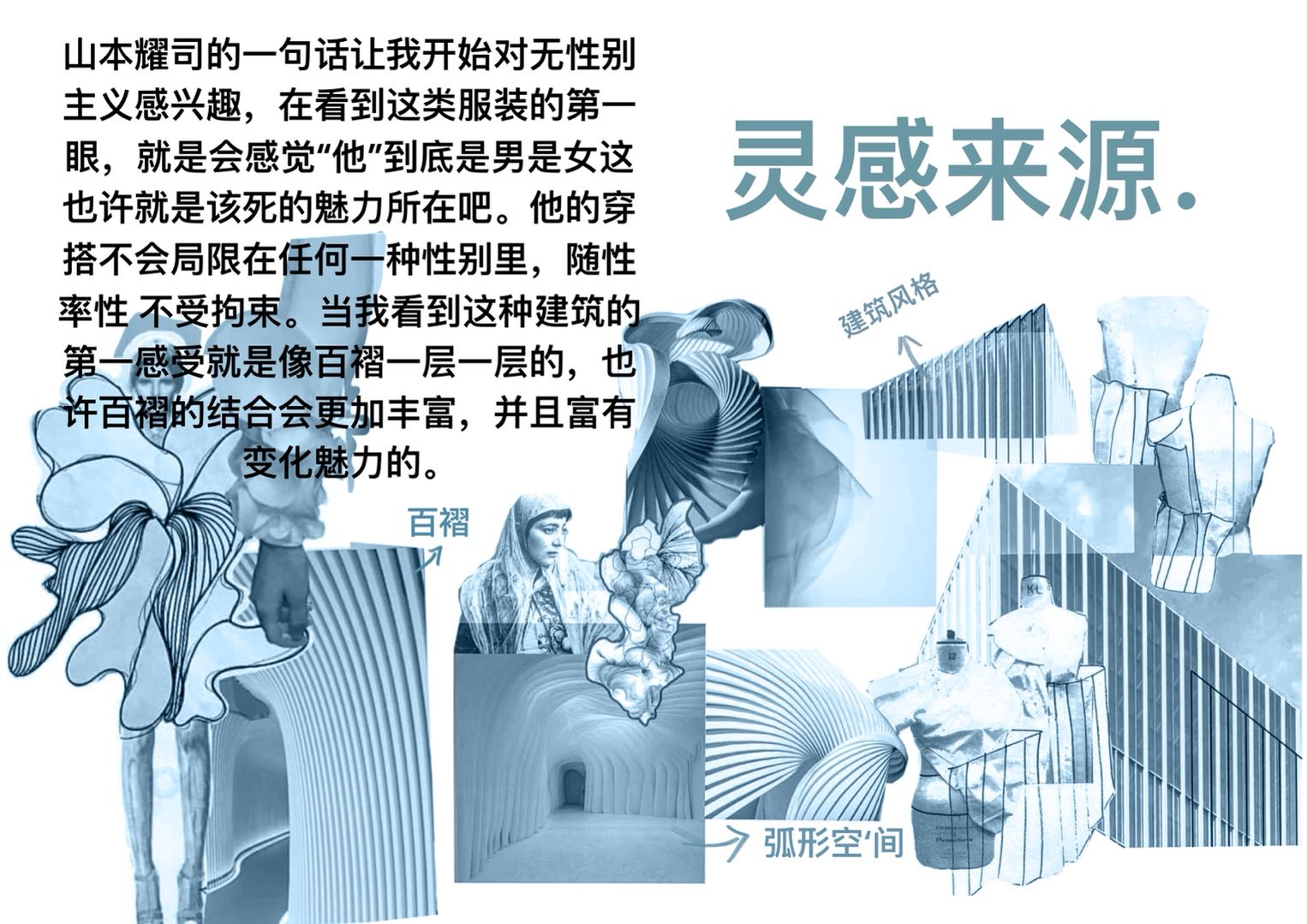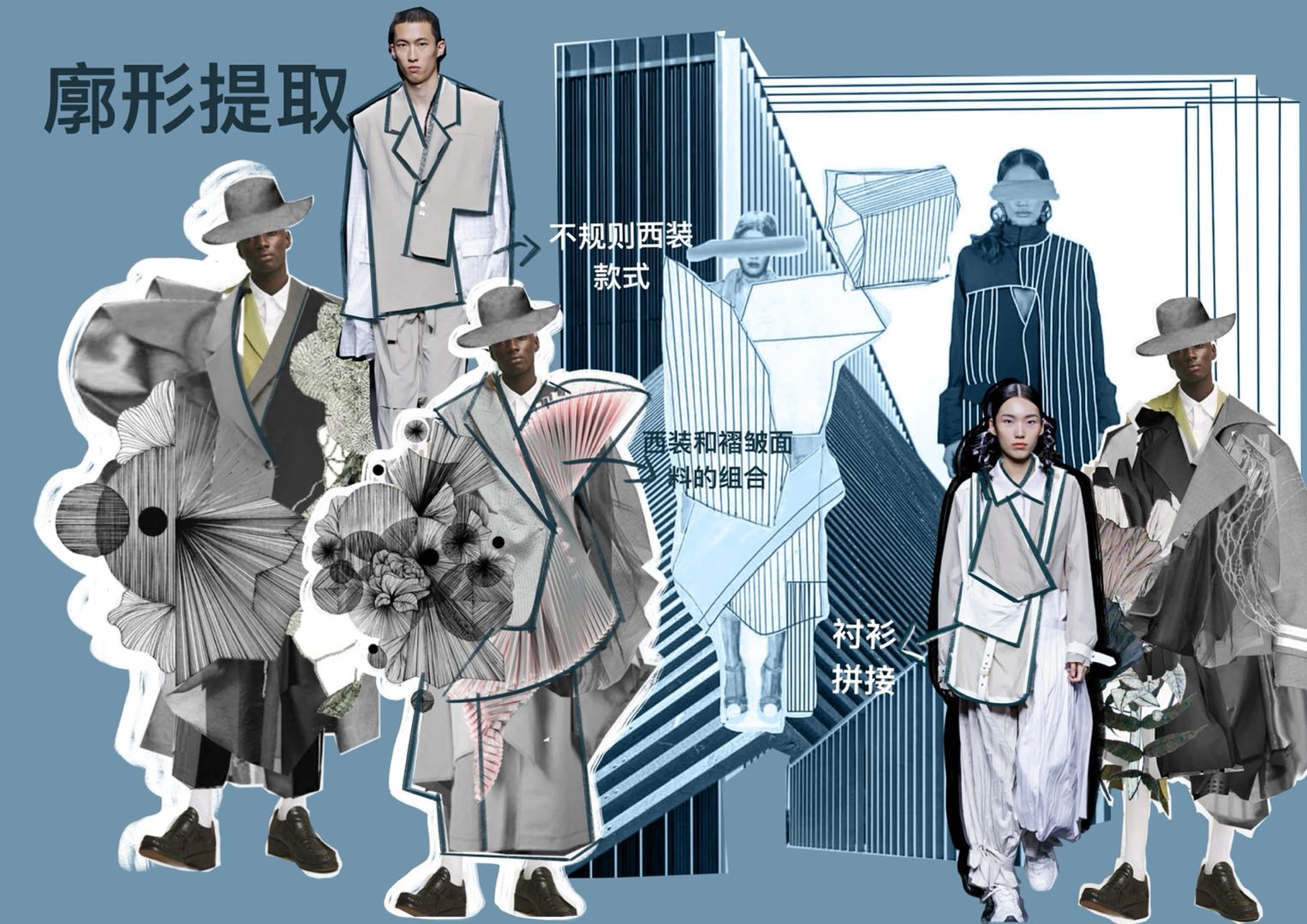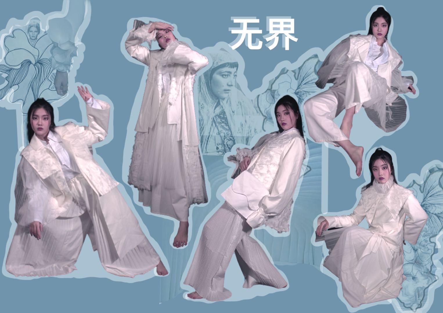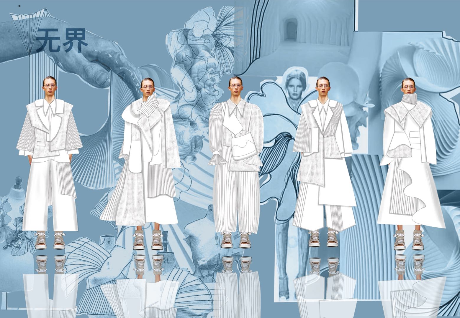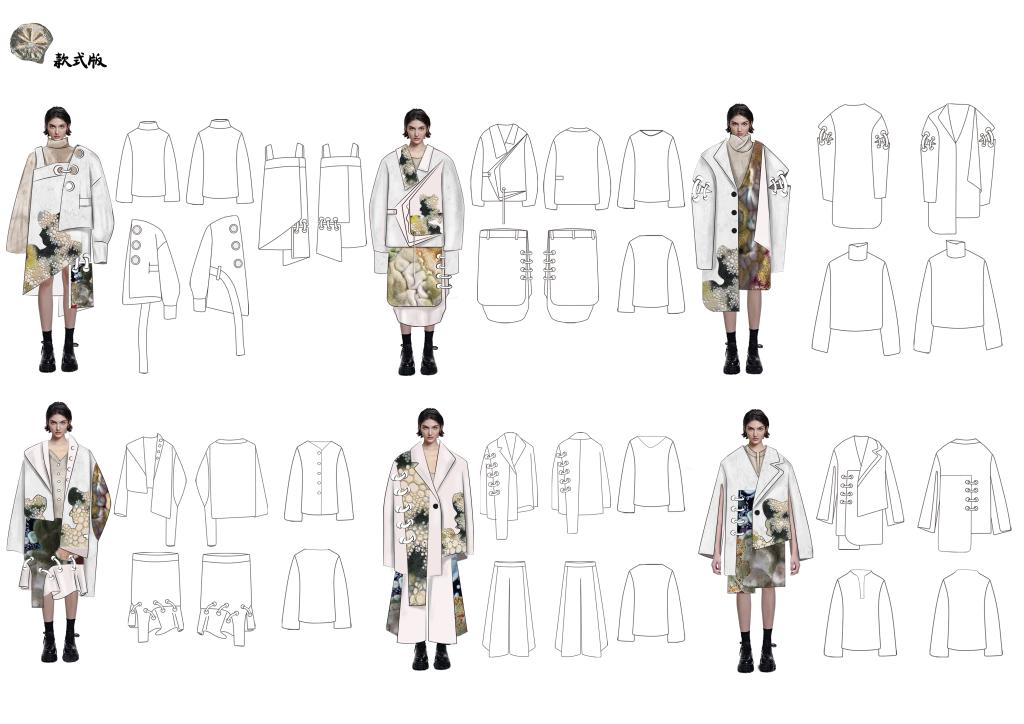 随着社会的发展,男女服装差异的缩小,由此设计了淡化性别的服装,运用面料再造的手法、机械和手工相结合的方式去表现设计。大廓形和干净的颜色去表现凸出服装主题。