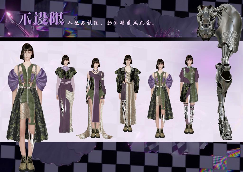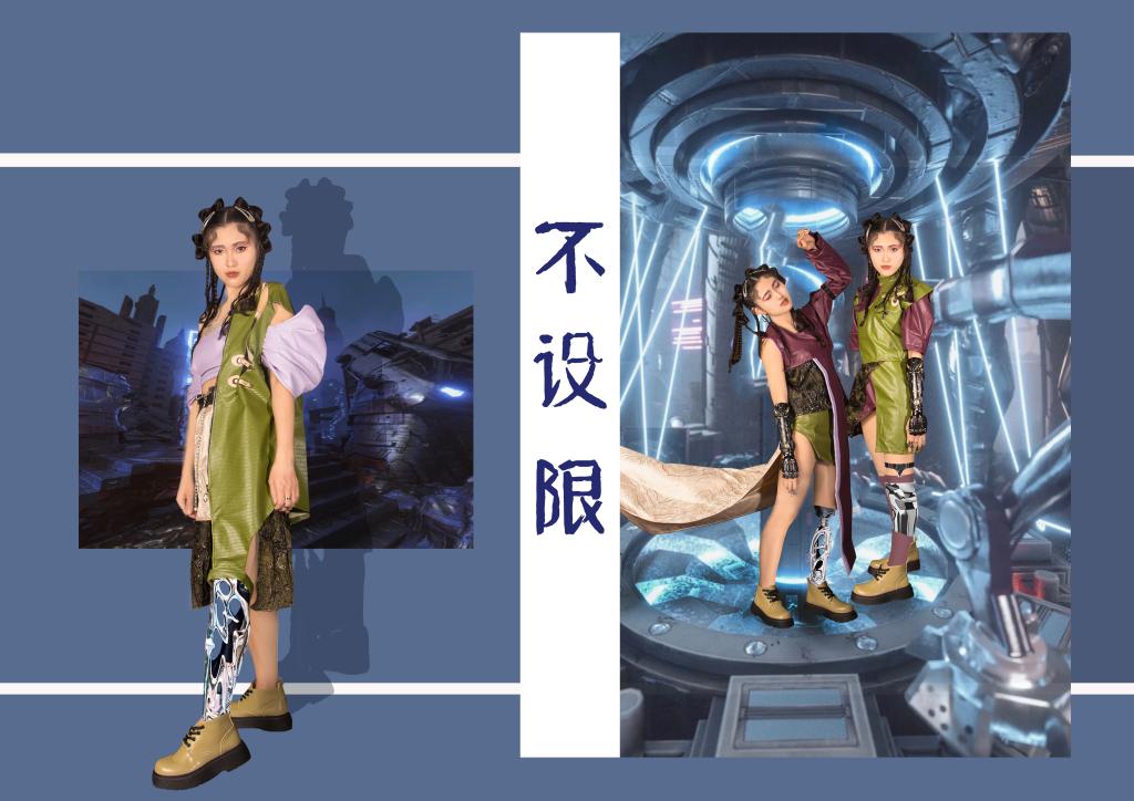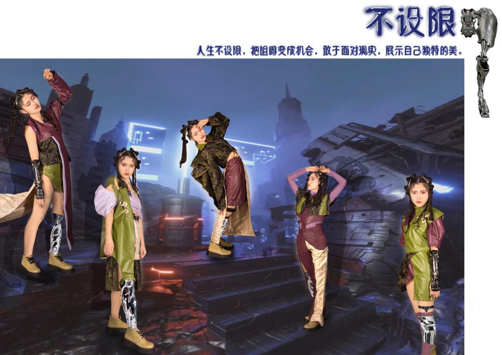 打造时尚机械姬的服装与服饰,将肢体障碍者的“不完美”转化为“不完美的完美”,重塑自我。在原有的基础上进行再造,打破常规的服装桎梏。希望肢体障碍者不再被奇怪的眼神灼伤内心,而是被当作时尚酷女孩一样被旁人欣赏。以强调观念和态度的表达——人生不设限。把阻碍变成机会,敢于面对现实,展示自己独特的美。
