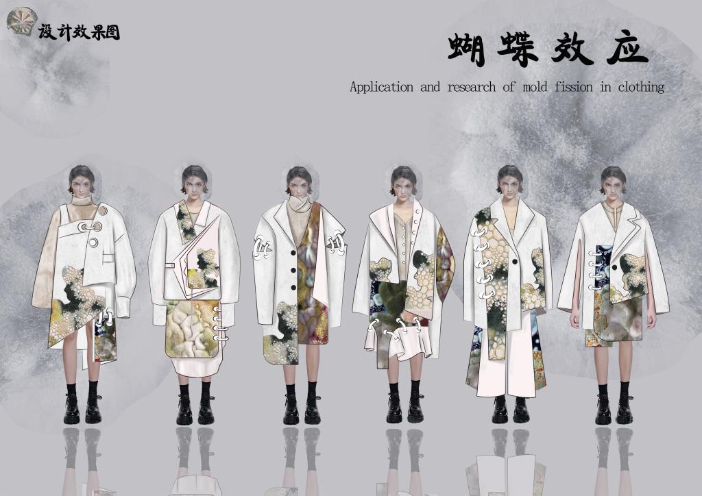 本设计以新冠疫情爆发为背景,探索人类与微生物共处的自然条件。文章基于可持续发展的视角下,结合绿色设计理念和仿生设计理念诠释现代女装的创新应用研究,同时,在服装面料中运用面料二次再造的设计方法,用羊毛毡仿生霉菌裂变,并将可食用的吉利丁粉、色素调运用在面料改造中,仿造腐烂肌理,形成独具特色的面料风格。以此来告诫微生物与人之间应该建立起互相依存、和平共处的平衡状态。创作了《蝴蝶效应》系列女装设计。