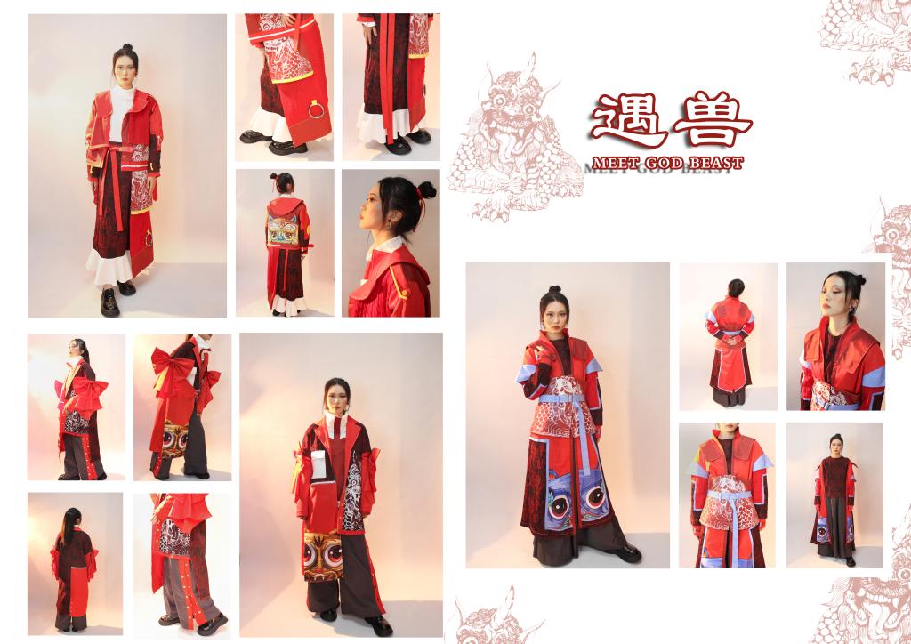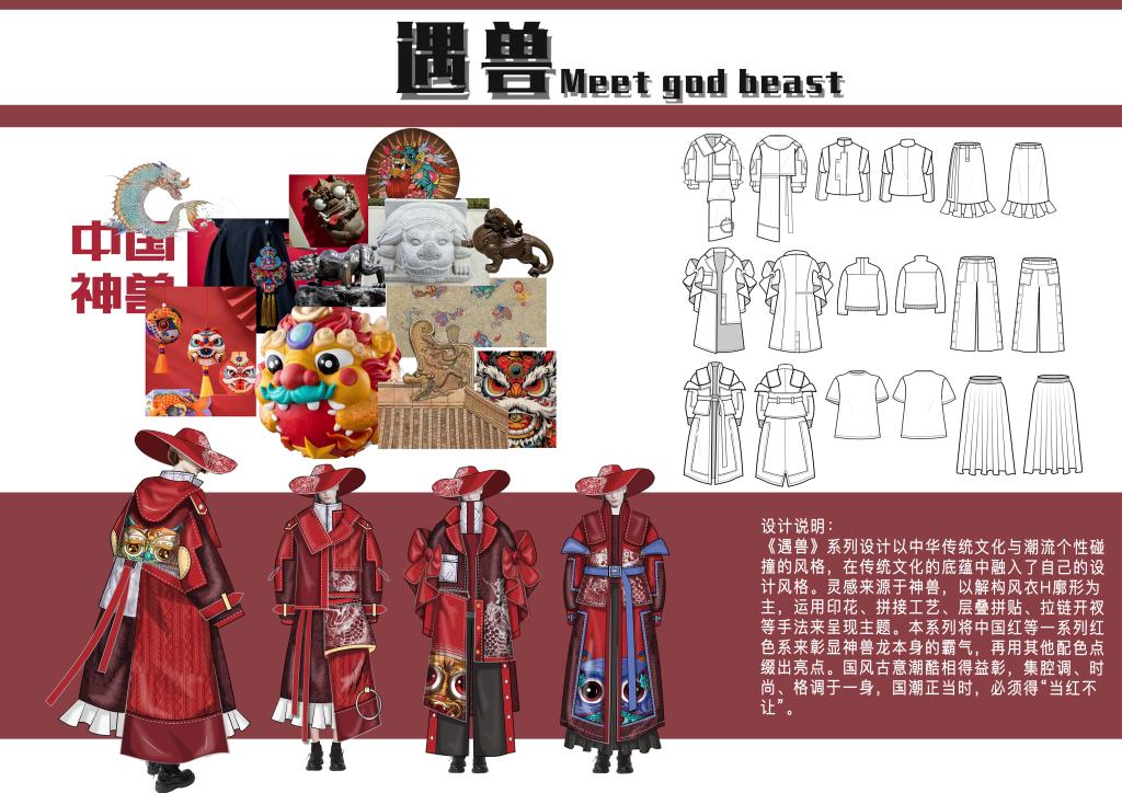北京是我国传统建筑的中心,特别是皇家建筑。本系列设计以北京故宫里的神兽为中心展开,主要围绕了其中一种神兽——龙的儿子老三蒲牢、老四狴犴、老七睚眦的形象特点进行插画创作,并结合故宫的一抹红墙作为灵感,设计出《遇兽》系列三款服饰。