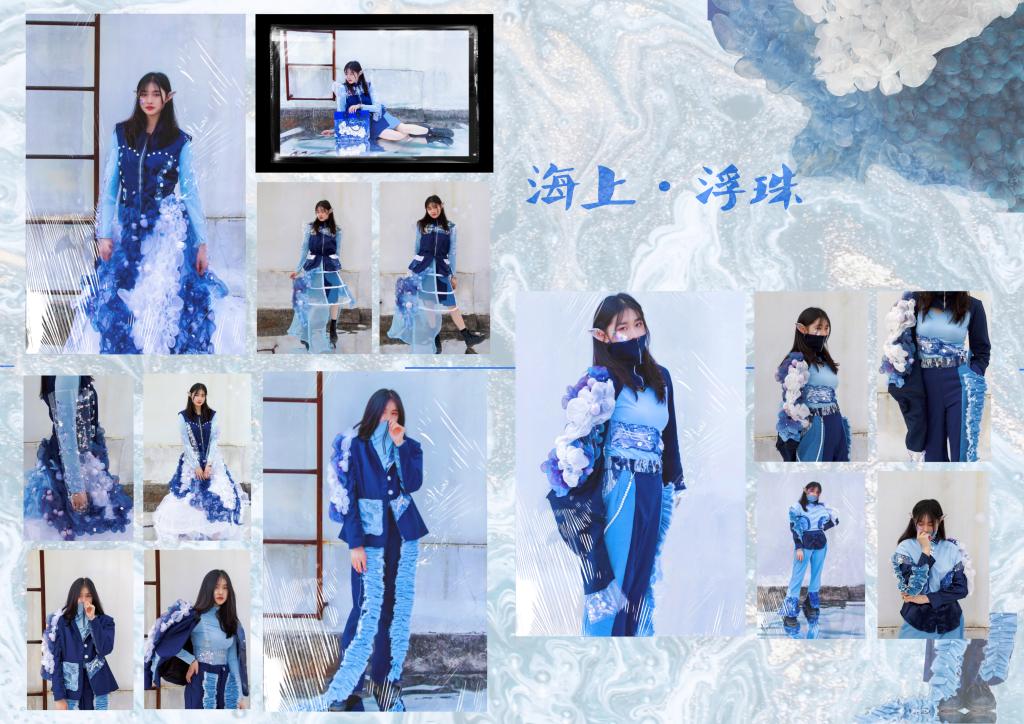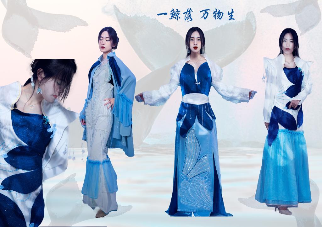 本系列设计是国风国潮女装的服饰设计,运用国风女装的廓形,旗袍领、开叉、立领、V领、裙褂、不规则袖子等廓形;元素上,提取鲸落元素,鱼尾、鱼骨、珊瑚、贝壳、蠕虫等元素,进行造型、工艺、面料的创作;色彩上以深海蓝、鲸肚白、天空蓝为主色调进行搭配;选用闪光、水光面料、西装垂感面料、肌理面料,工艺上运用了珠片刺绣、流苏、抽褶的设计手法。把鲸落元素运用与国潮女装的设计中,体现国潮女装华美、鲸落向死而生壮美的同时,从侧面烘托“遵循自然之道,保护海洋生态环境”的设计理念。