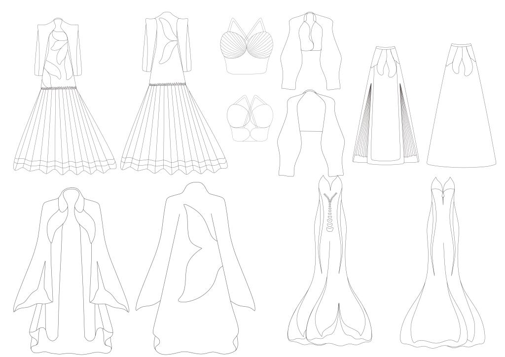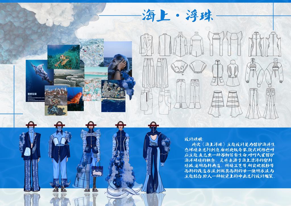 此次设计是为保护海洋生态环境来进行创意,廓形比较夸张,款式风格也呼应主题,表达出一种万物皆有生命,呼吁大家保护环境的概念。运用面料再造,研究欧根纱等面料的改造方法,创新其面料的单一使用方法,与主题结合,给人一种视觉上的冲击进行设计服装。