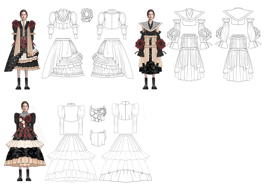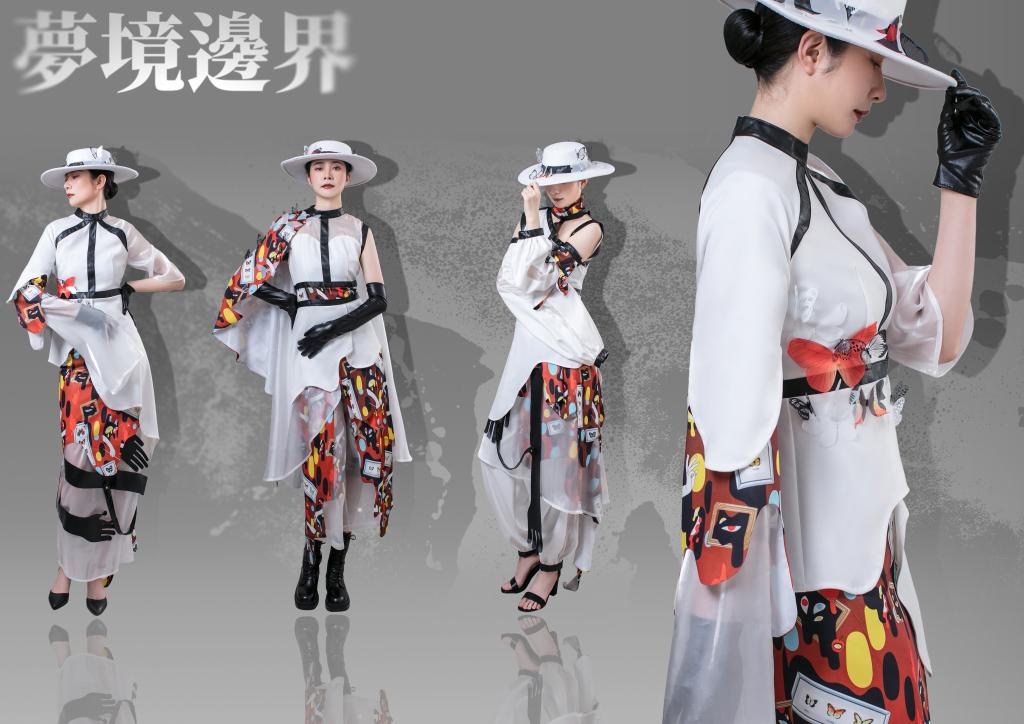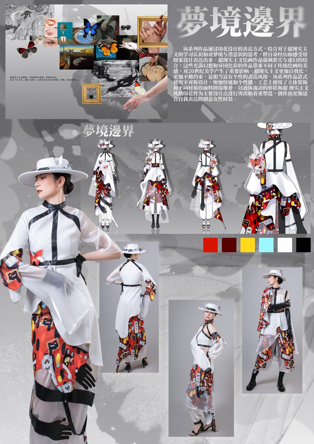 该系列作品通过印花设计的表达方式,结合对于超现实主义的学习认识和对梦境与潜意识的思考,将自身经历和感受用图案设计表达出来。超现实主义绘画作品强调真实与虚幻的结合,这些充满幻想和异国色彩的作品带来不同于传统绘画的美感,对20世纪美学产生了重要影响。超现实主义更加自我化,更加不被约束,是相当富有个性的表达风格。该系列作品款式使用不对称设计,增加怪诞和个性感。工艺上使用了立体装饰和不同材质的面料拼接堆叠。以液体流动的形状和超 现实主义风格印花作为主要设计点进行突出和着重塑造,创作出更加适合自我表达的创意女性时装。