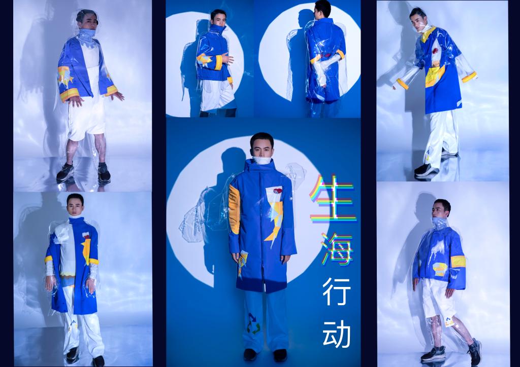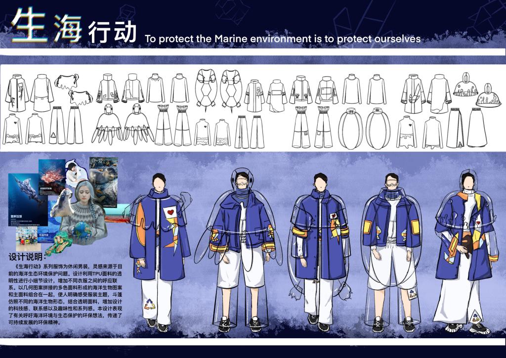 本系列服饰为休闲男装,一共五套二十件,灵感来源是目前的海洋生态环境保护问题,用更加贴合年轻人的潮流方式,向人类,特别是年轻一代,传递保护与可持续发展海洋生态这一观点。从内搭外套再到斗篷,具有服装的层次感,利用TPU面料的透明性进行小细节设计,增加不同衣服之间的呼应联系。以几何图案拼接的不同颜色面料形成的海洋生物图案和蓝色主面料组合在一起,使人明确感受服装主题,斗篷仿照不同的海洋生物形态,结合透明面料,增加设计的科技感、联系感以及趣味性和系列感。本设计表现了有关呼吁海洋环境与生态保护的环保想法,传递了可持续发展的环保精神。这套设计的名字叫做《生海行动》,“生”是生态的生,是生物的生,是生命的生,它既包含了这三重含义,也表达了“深海”的意思,保护海洋生态是刻不容缓的行动,主要是提醒人们注意海洋污染以及生态保护问题,更深层的含义在于给青少年一代传递保护海洋环境的意识。