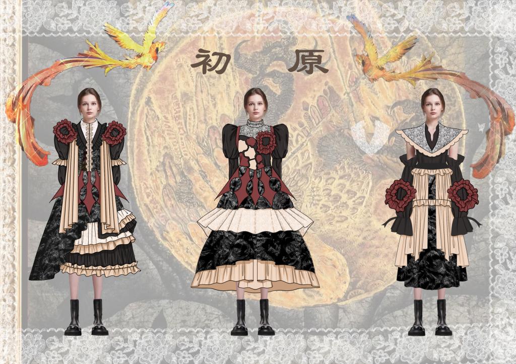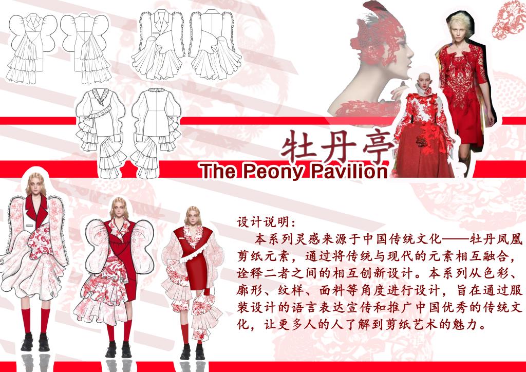 本系列服装以牡丹凤凰剪纸元素为图案进行多角度创新设计,利用解构的设计手法将剪纸图案进行提取然后再设计,利用视觉规律将色彩进行分割,将正红色作为本系列的主题色与之映衬,采用深色和浅色相互搭配,增强整体视觉效果的节奏感和平衡性。