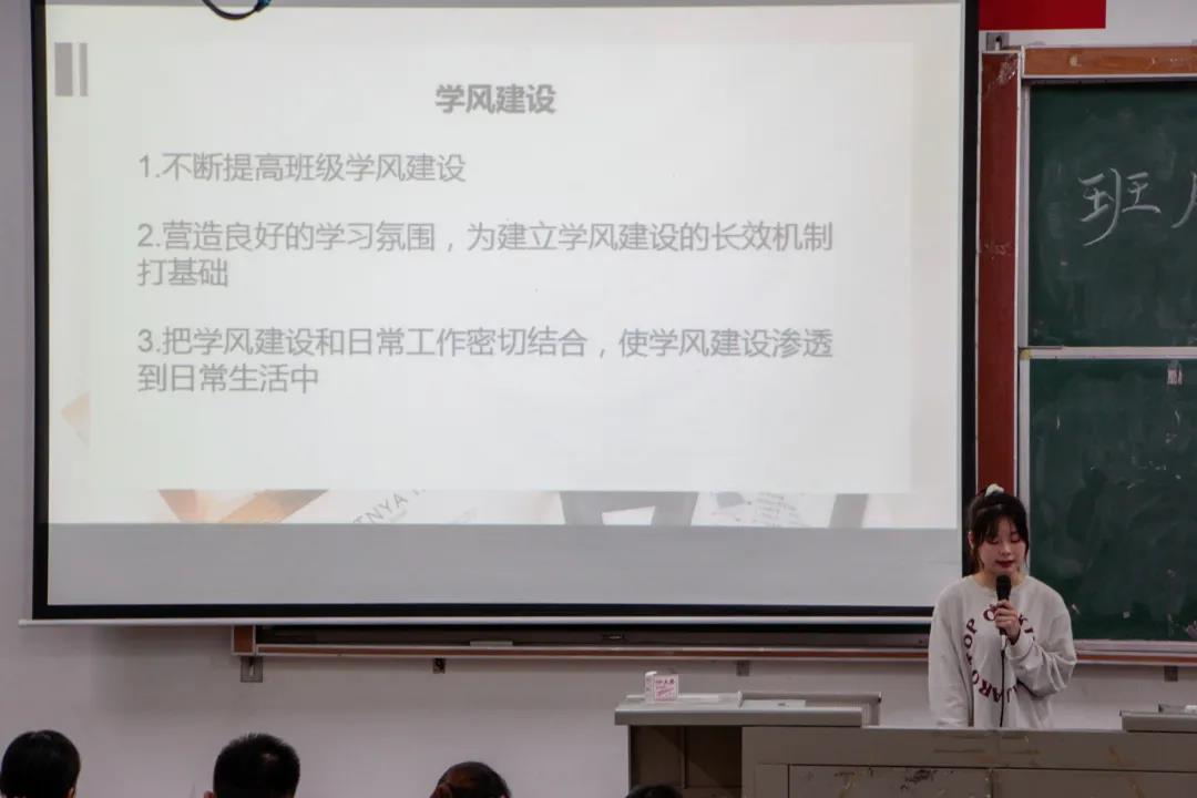 评选过程中,各班级代表依次上台汇报,他们分别从学习风气、素质拓展、组织纪律、教室宿舍文明四个方面进行陈述,为大家展现各自班级的良好学习风气和积极向上的精神风貌。