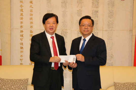 公司董事长戴宏达博士捐赠两百万善款由黄溪连大使代表接受转交祖国疫区