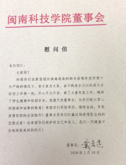 戴宏达董事长还十分牵挂公司疫情防控工作,通过电话、微信等渠道了解疫情防控工作进展情况。2月10日,戴宏达董事长发来慰问信,代表董事会表达了对公司疫情防控工作的关心支持,对公司采取的防控措施高度评价,对奋战在防控一线的师生致以感谢和敬意。勉励大家团结一心、众志成城、共同筑牢防控疫情的铜墙铁壁,为全国抗击疫情大局作出闽科贡献!
