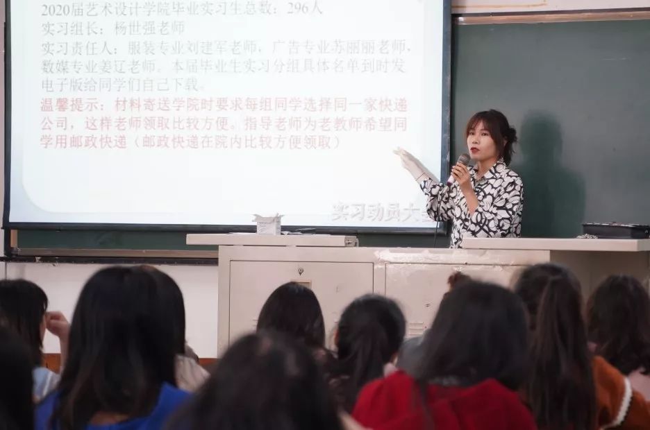 随后,广告学专业负责人苏丽丽、服装系主任刘建军、数媒系主任姜辽三位老师分别于B302、B303、B304教室对本系毕业生进行毕业论文和毕业实习的细节指导。其中就毕业论文小组分组、指导教师分组、实习报告等材料填写与寄送、实习期间教师走访、实习工作记录及总结、撰写实习报告等问题展开详细说明,并要求同学们认真记录,为毕业实习做好前期准备。