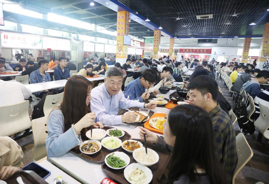 4月11日中午,张杰来到员工第一食堂,了解食堂菜色、菜品、卫生、经营等情况,并与员工一起排队,使用餐卡点餐,与员工共同就餐。进餐过程中,张杰与同桌的同学们亲切交流,认真听取了同学们的意见和建议。针对同学们反馈的食堂饭菜质量价格、管理服务、就餐环境等方面的问题逐一做了回复,并要求相关部门及时进行研究整改。