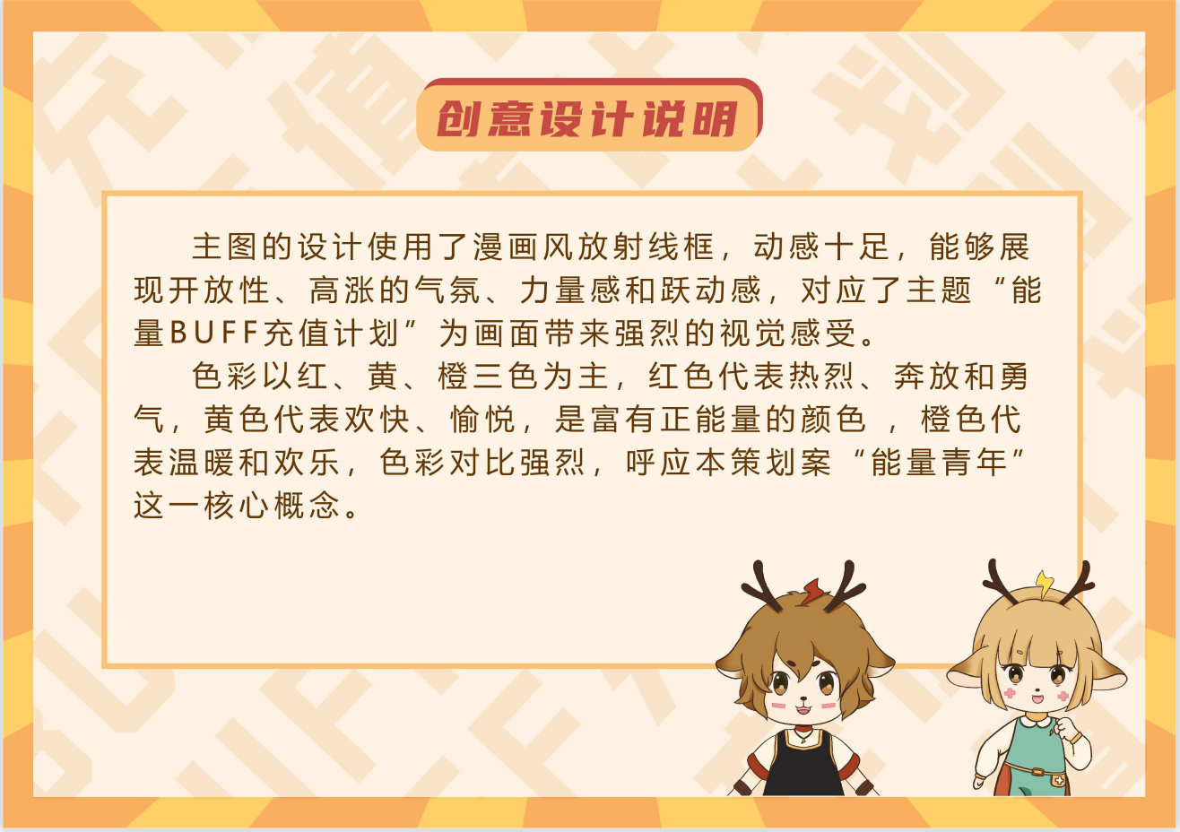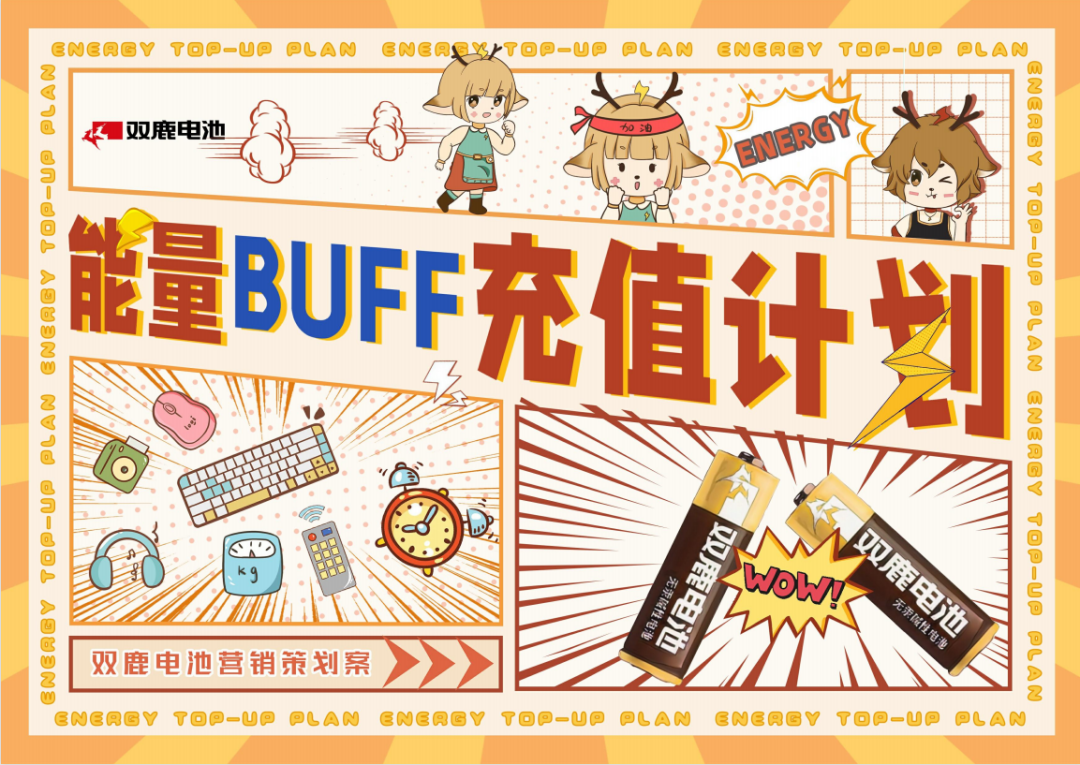 设计说明:人生就是不断充电的过程,每个人都需要“能量 buff〞,我们每天都在做很多小事为自己充电,进行“能量积分〞充值。电池作为生活中的必需品,为许多能够提升生活幸福感的物品提供能量,维持其运行。将双鹿电池与美好生活挂钩,赋予品牌情感价值,既能向大家展示双鹿电池的核心卖点,也能体现能量青年的核心概念。叠满能量buff,保持对生活的热爱,为美好生活充电蓄能。