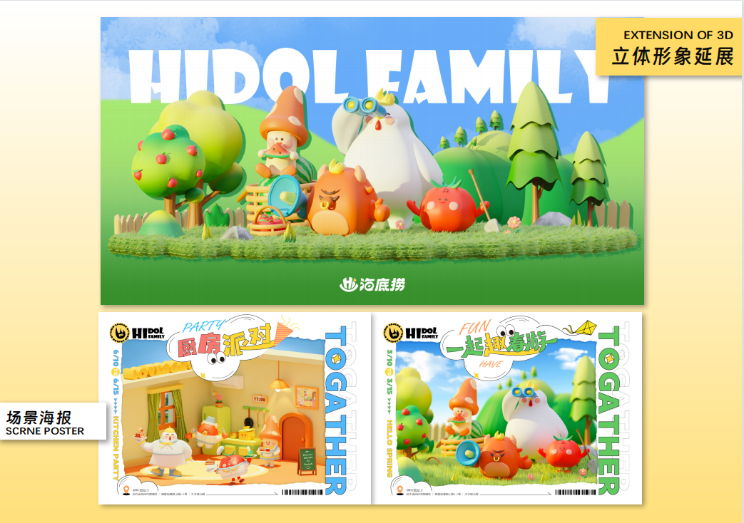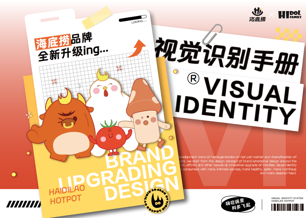 设计说明:本次的Vi视觉传达设计是以海底捞品牌为载体,为该品牌设计一套家族式的IP家族。IP的设计灵感来源取自于海底捞的四款锅底,分别是牛油辣锅、猪肚鸡汤锅、番茄锅和菌菇锅。根据海底捞受众群体的消费喜好,设计外表颜值为可爱的IP形象,在后期的设计中也加入了盲盒设计、变装套装等年轻人喜欢的潮流单品。本次的作品重点设计是将海底捞的品牌文化和产品特殊注入IP形象,并且加入情感化设计,将平面的人物设计人格化。