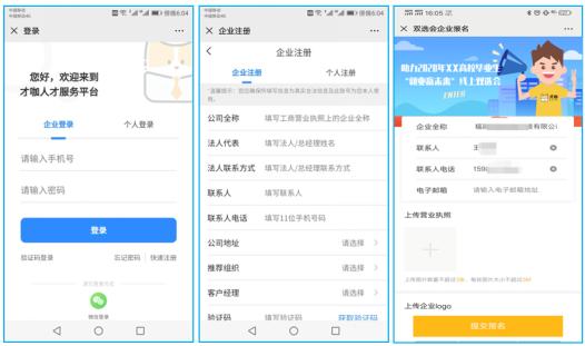 5) 企业报名需要提交、上传以下有效信息:企业营业执照,企业法人姓名、联系方式,招聘负责人姓名、联系方式,发布真实招聘岗位。
