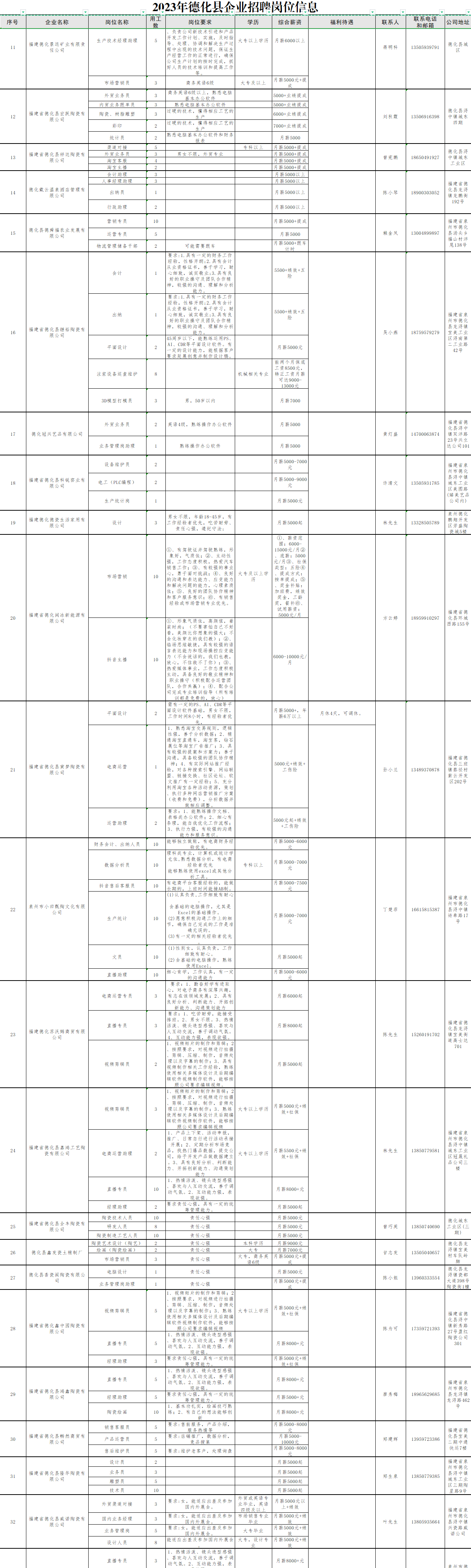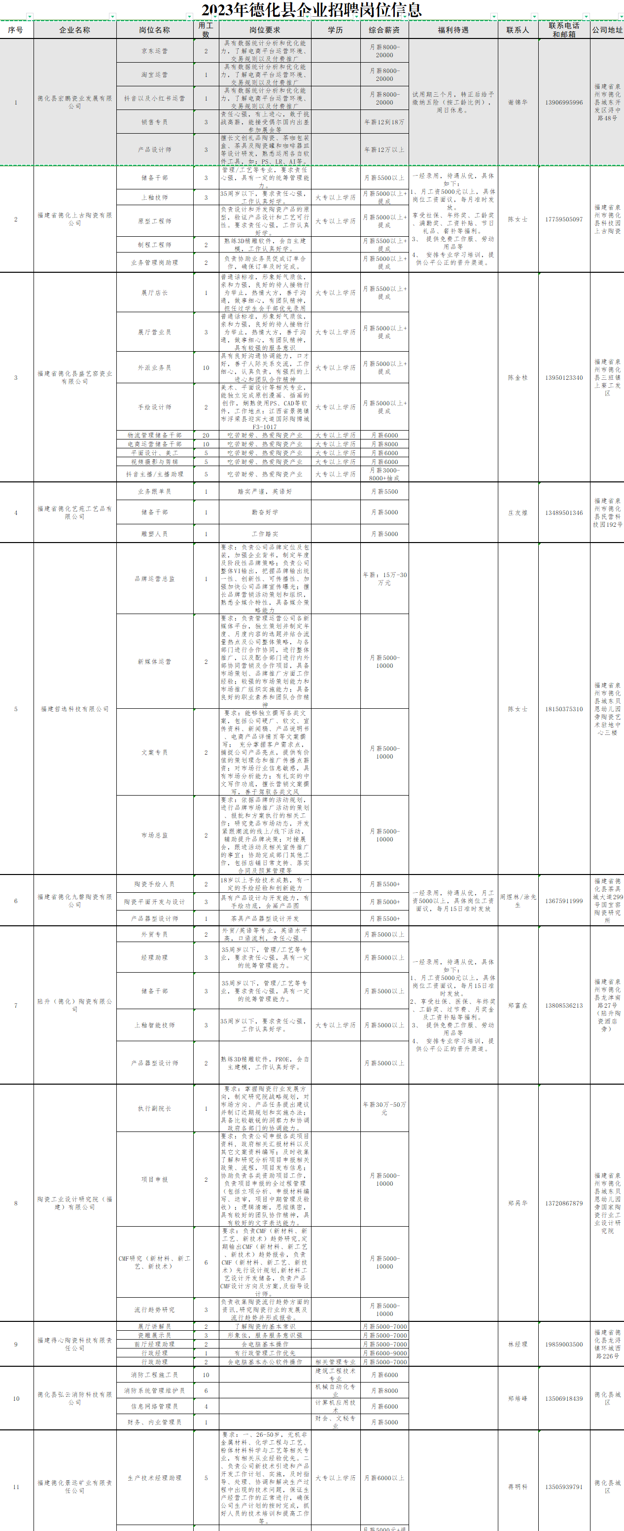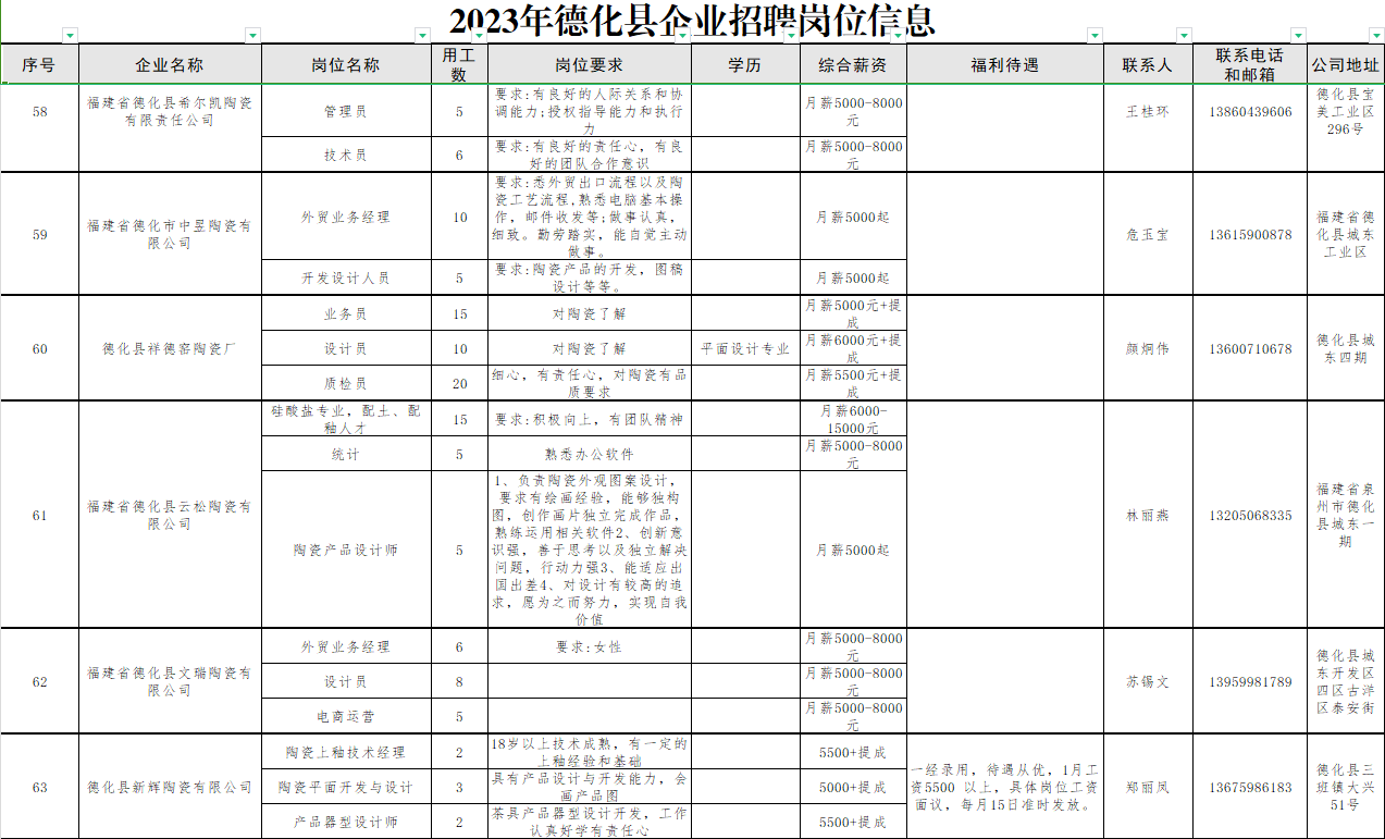 2023年德化县企业招聘岗位信息